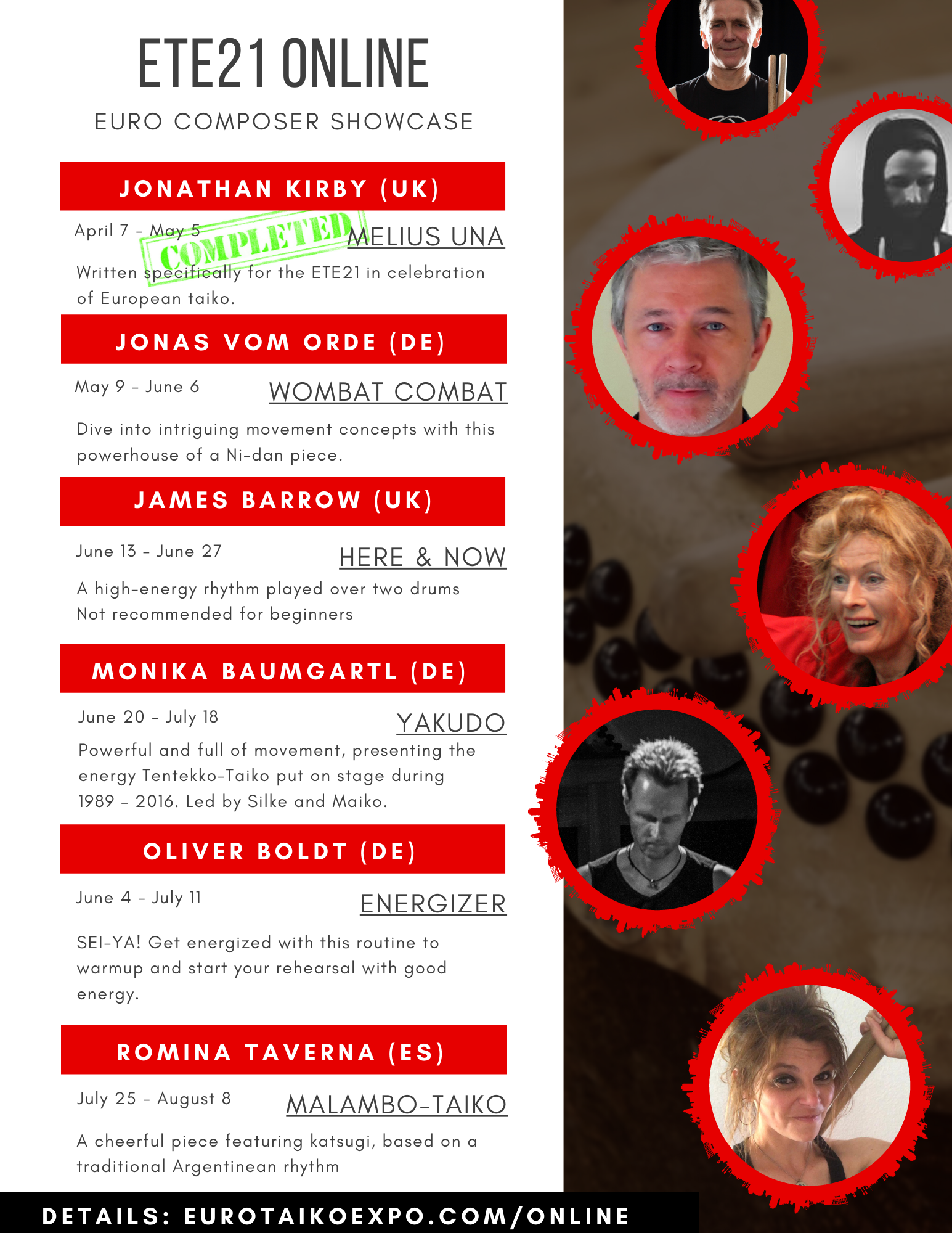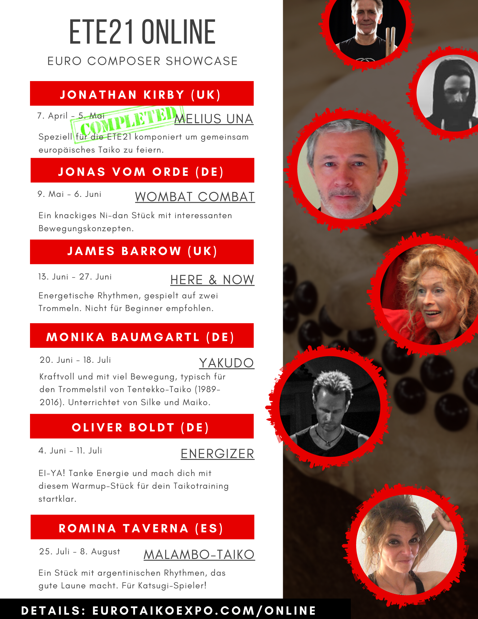 Please note that only concert performers, session leaders and stall holders are to be European-based. We welcome ALL taiko enthusiasts, regardless of background, to take part in the events associated with the ETE21.