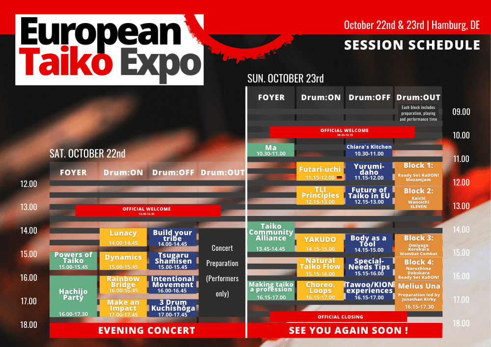 Vernetzung, Austausch und Lernen; diese drei Elemente sind für die Entwicklung der Kunstform des Taiko und dessen Community von großer Wichtigkeit. Die Expo Tage ist eine Möglichkeit die dafür bereits bestehenden Ressourcen zu bündeln. Der Ablauf und der Inhalt der Expo Days ist völlig von der Community, also von DIR abhängig. Sei ein Teil der Expo!